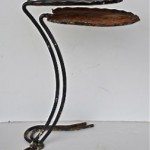 Estate condition with surface rust patina. Larger table 23”- H x Leaf surface 11” x 11”. Smaller table 21”- H x Leaf surface 11” x 11”.