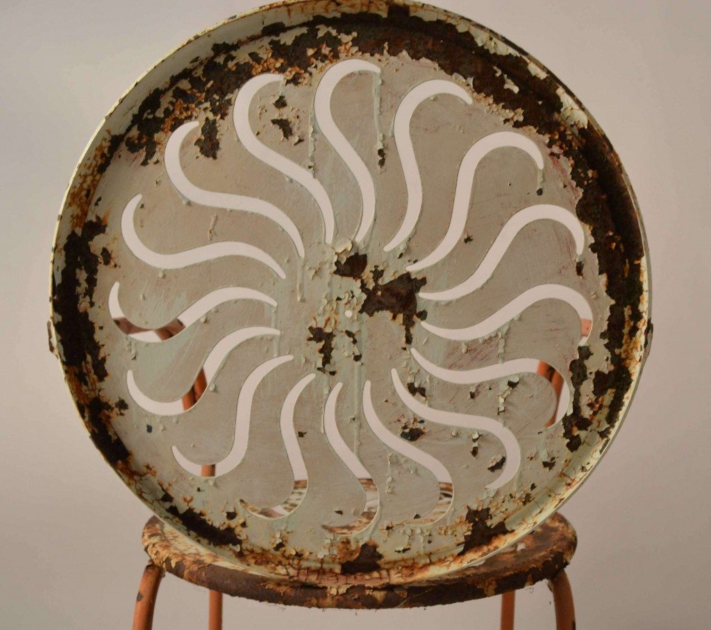 Both chairs have spiral cut work backs and seats-strong design and presence. Structurally sound tubular frames, cut sheet steel seats and backs. 33.5″ – H x 20″- D x 16″- H to seat.