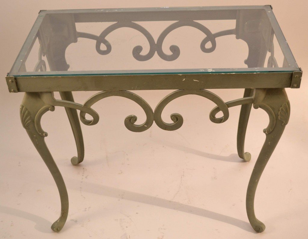 Classical style cast aluminum base with shell carved cabriole. Original glass top included but it has a small chip. Later grey paint over original white paint surface.