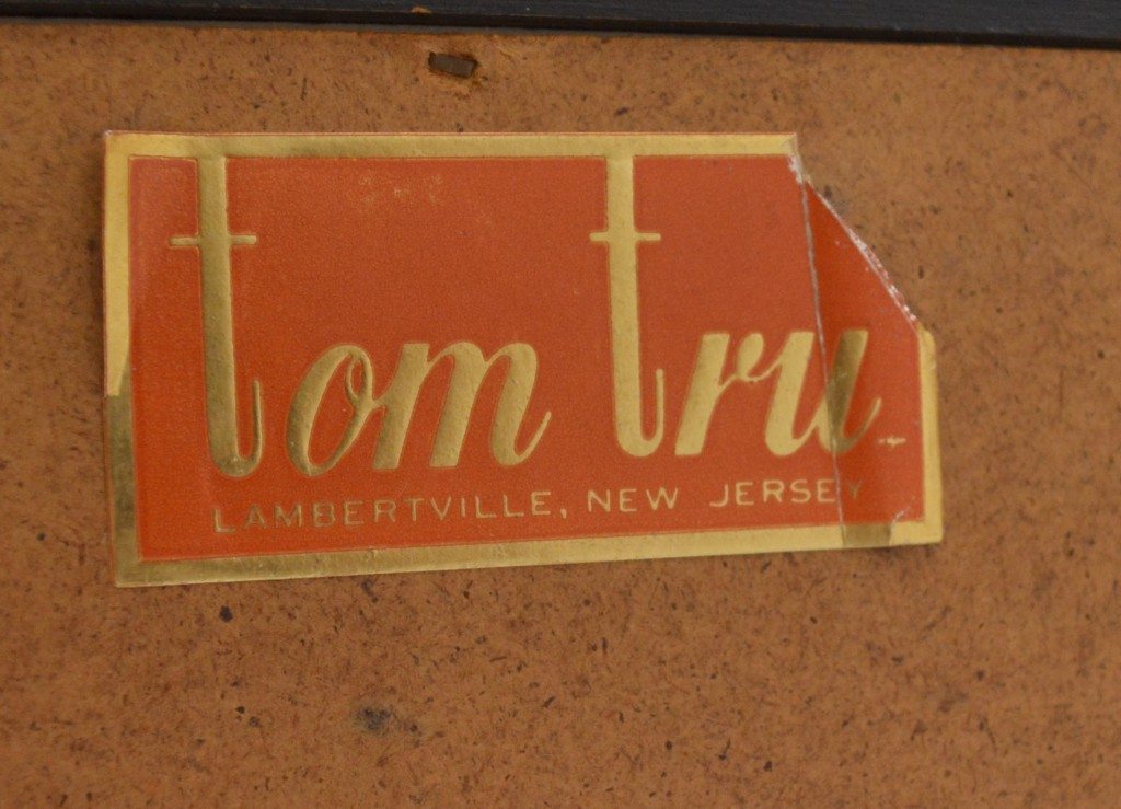 By “Tom Tru” distributed by Raymor. Black frame with cream boarder-decorated mirror ground with repeating Mod pattern. 38″- H x 22″- W x 1.5″ deep.