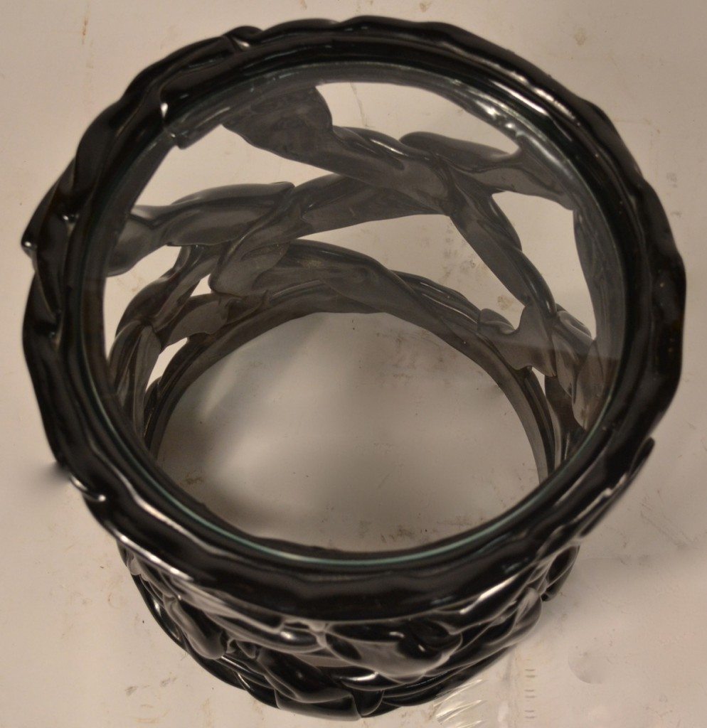 Black plastic “ribbon” body with clear glass top. 16.5”- H x 14.5”- Diameter.