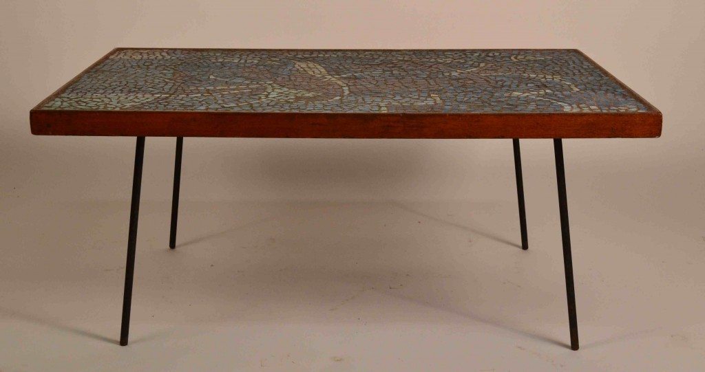 | Classic Mid Century Modern Tile Top coffee table. Wood frame top,black iron rod legs, remains of original paper label. Probably California manufacture. |