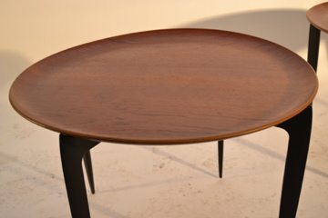 Tray top table – folding black base, teak tray top.