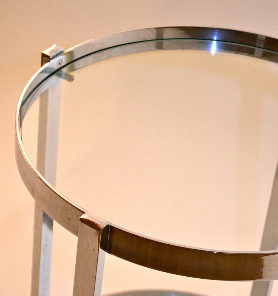 | Attributed to Milo Baughman. Chrome with Plate Glass Shelves. |